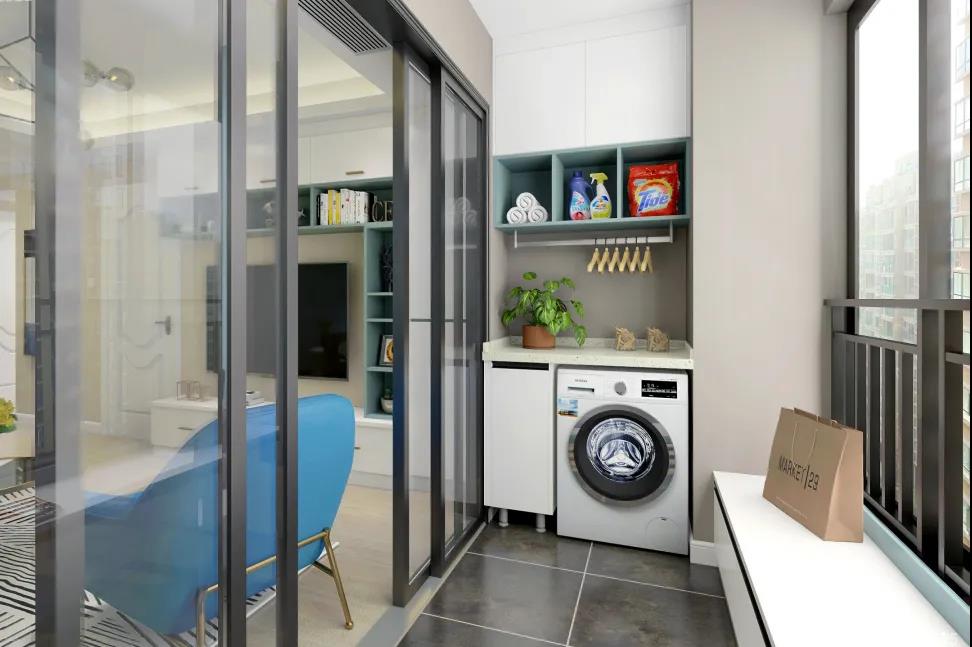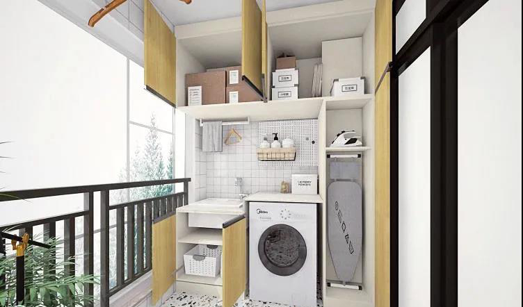 张先生平时爱做家务,希望有个专属阳台家务区,最好是有较大储物空间,能放下杂七杂八的家务用具和洗衣机。