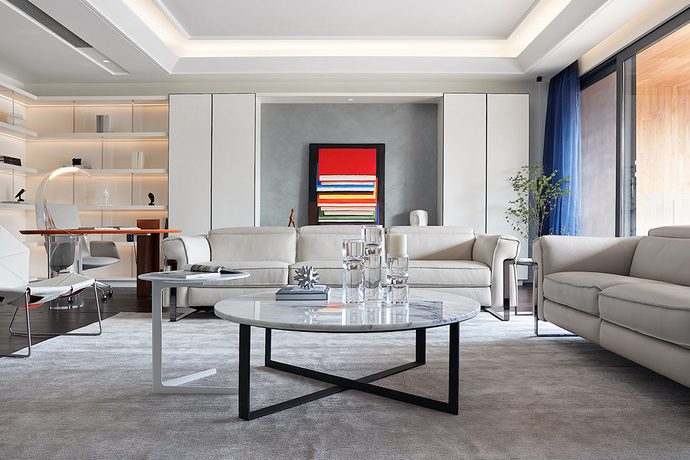 在这套私宅设计中,设计师基于业主的文学艺术修养与审美意向,以现代简洁黑白视像,间以明媚的亮色块点缀,呈现纯粹静谧的氛围,藏匿于其后的是文化与艺术交融荟萃的空间内涵
